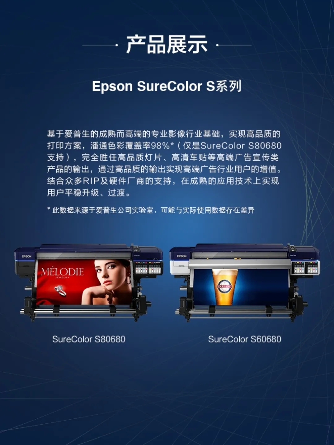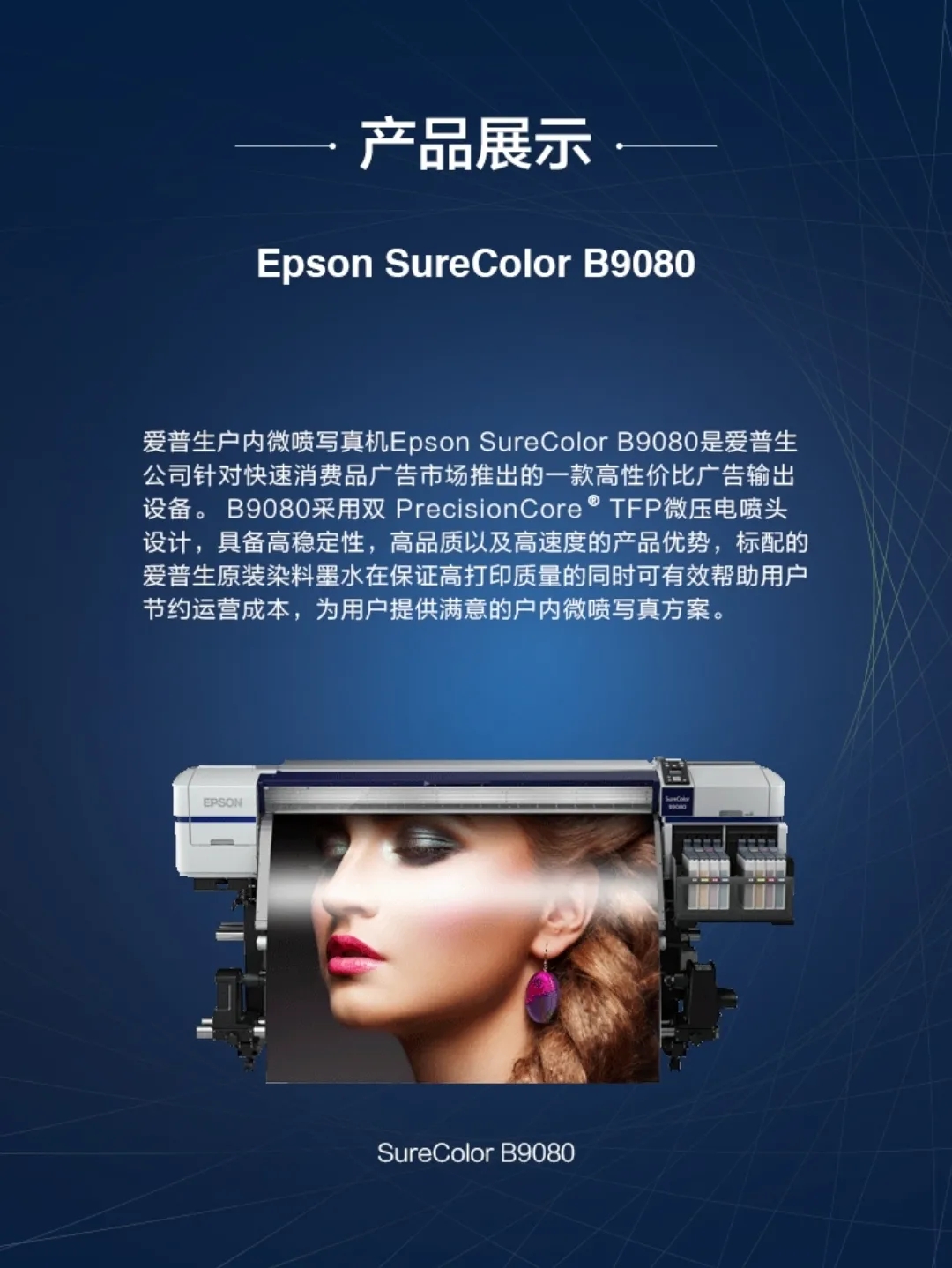 爱普生亮相第二十届上海国际广告标识展的快消产品 发布时间:2020-9-12 22:29:08 Epson SureColor B9080 针对快速消费品广告市场推出的 一款性价比广告输出设备。 双微压喷设计 使产品具备高稳定性,高品质以及高速度。 标配爱普生原装墨水 Epson SureColor S系列 基于爱普生数码打印机的成熟而高端的专业影像行业基础 实现高品质的打印方案。 能胜任多类高端广告宣传类产品输出 实现高端广告行业用户的增值。 < 上一篇 下一篇 >