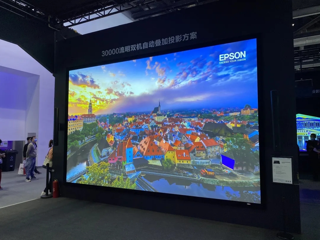 此次爱普生在2020 InfoComm China展区中展出的30,000流明双机自动叠加投影方案由2台爱普生30,000流明*1*2CB-L30000U 激光工程投影机搭载ELPLU05短焦镜头组成,采用投影机内置的自动叠加功能,可实现60000流明低成本超高亮度方案。