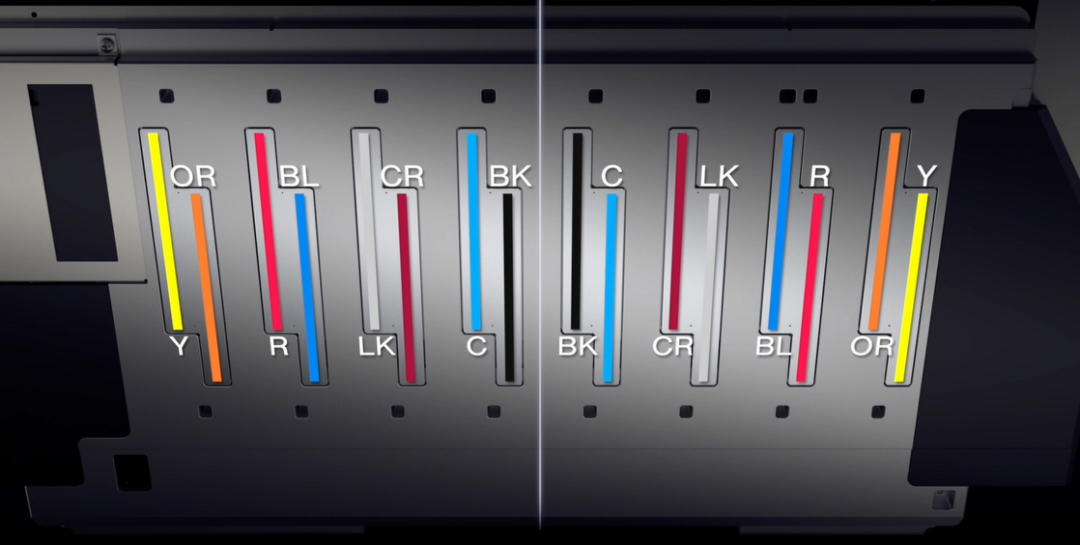 除精准控制墨滴落位外,在打印头喷射的墨水色彩排列方面,ML-8000也拥有“独门秘籍”。8种颜色墨水以对称形式排列于8个打印头的16个通道上,即使在双向打印操作下,也能够保证均匀的打印效果和稳定的呈现品质。
