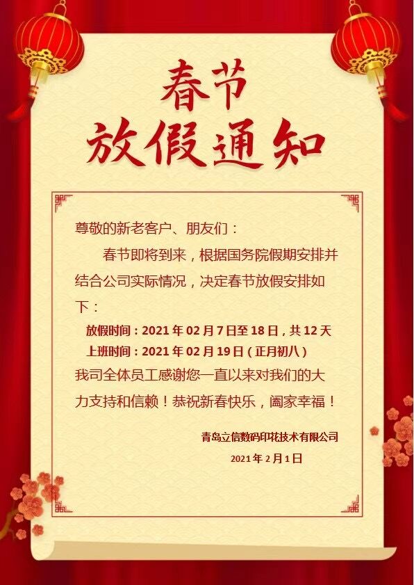青岛立信数码印花技术有限公司2021年春节放假通知 发布时间:2021-2-6 23:47:10 尊敬的新老客户、朋友们: 春节即将到来,根据国务院假期安排并结合公司实际情况,决定春节放假安排如下: 放假时间:2021年02月7日至18日,共计12天 上班时间:2021年02月19日(正月初八) 我司全体员工感谢您一直以来对我们大力支持合信赖!恭祝新春快乐,阖家幸福! < 上一篇 下一篇 >