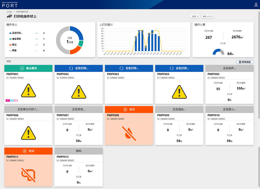 一台数码打印机的状态可以轻松掌握,如果变成N台呢?甚至,分散N地的N台?随着生产规模的扩大,生产类型的增多,打印输出设备的管理难度也呈几何倍增。此时,拥有Epson Cloud Solution PORT,一切问题迎刃而解。云端平台实时监测,多维度展现数码印花机打印机运行状况及打印数据: