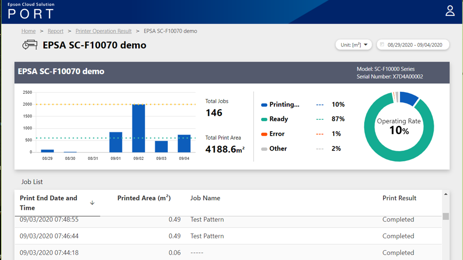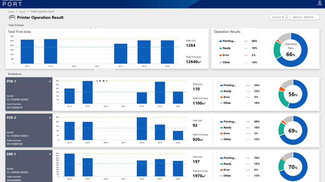 爱普生数码印花机大数据分析,带来全新商业可能 发布时间:2021-3-15 13:26:24 众所周知,数据已经成为企业获得竞争优势的新基础,数据分析则通过推动业务创新日益成为企业实现增长的引擎。通过Epson Cloud Solution PORT,客户可以根据业务需求,灵活选取数码印花机打印数据报告,多层次了解数码打印机运行状况和业务运行状况。由此分析日常的工作情況,有助于改善不同机种之间的偏差,减少数码印花机打印机的待机时间,为进一步提升业务的效率带来新的可能。 <总体打印情况信息> <打印机运行报告> <详细打印数据报告> < 上一篇 下一篇 >